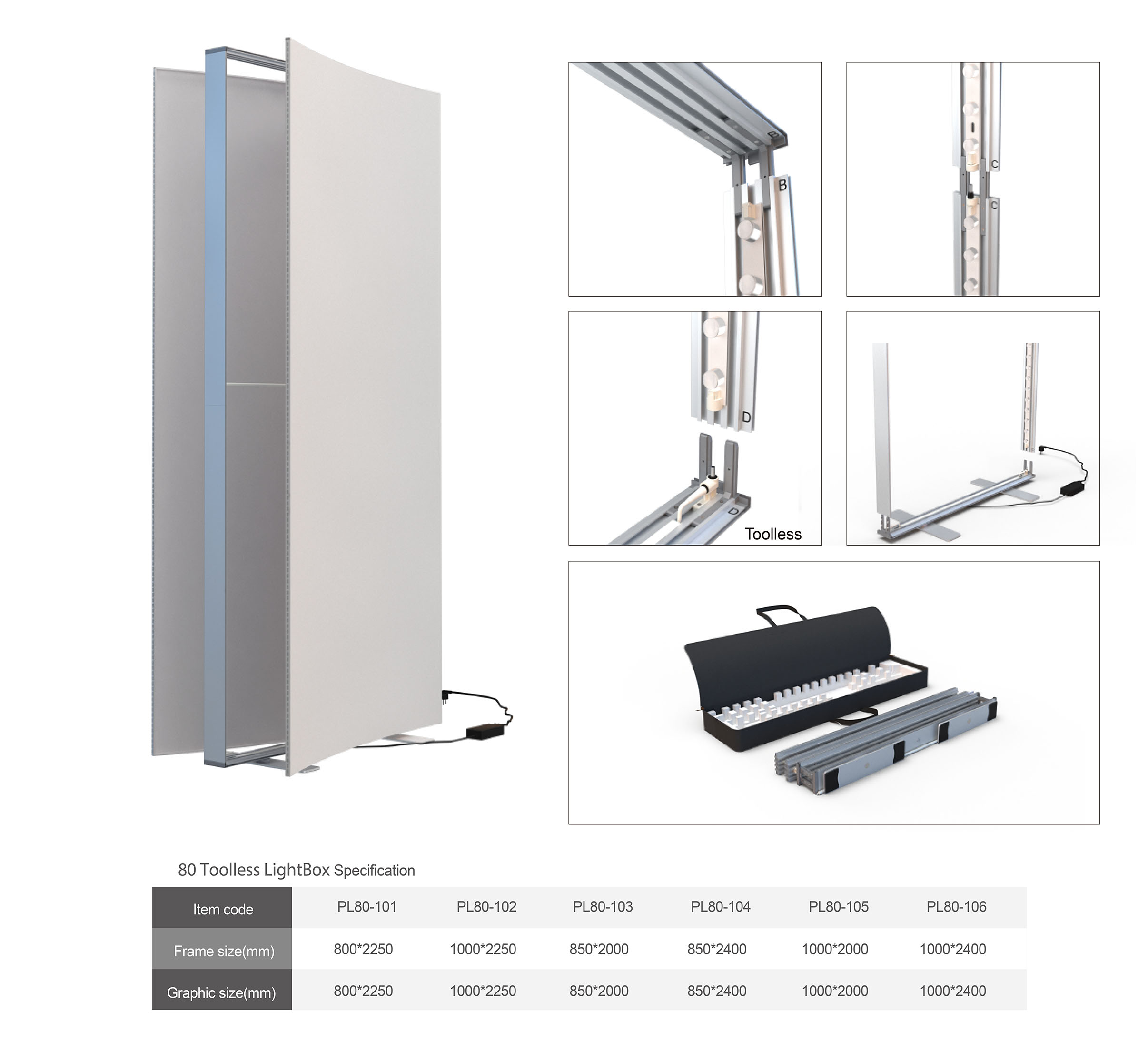 The 80mm depth double-sided SEG lightbox features a standard height of 2 meters, with two standard width options available.